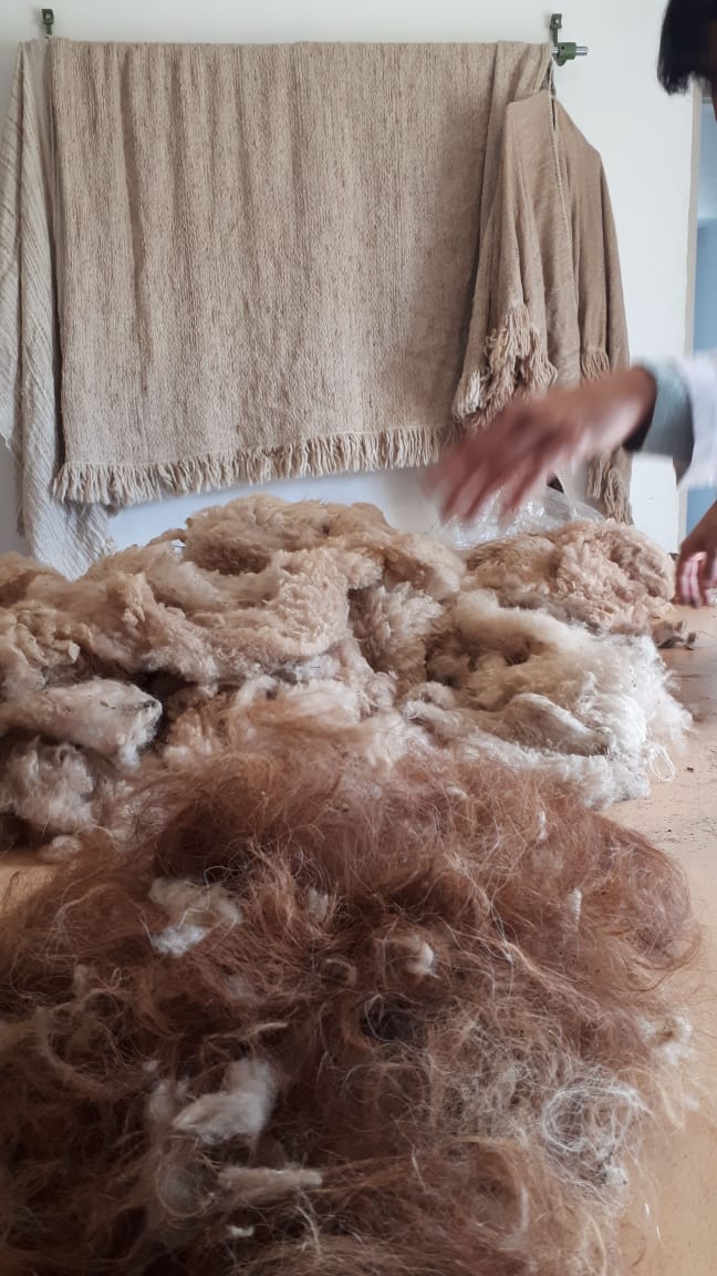 La primera selección de fibras del vellón se realiza manualmente. Dentro de las fibras naturales, la llama contienen cerdas, que son fibras más gruesas y crimpadas, con características distintas al resto. Se traducen en sensación de picazón en el producto final. Para evitar esto, trabajamos en una selección más exhaustiva, donde se descartan las cerdas y se extrae la fibra más sutil. Se obtiene una fibra lista para la hilatura: 20 micrones o menos para la fibra de llama, 15 a 12 micrones para la fibra de guanaco y 13 a 11 micrones (o menos) para la fibra de vicuña.